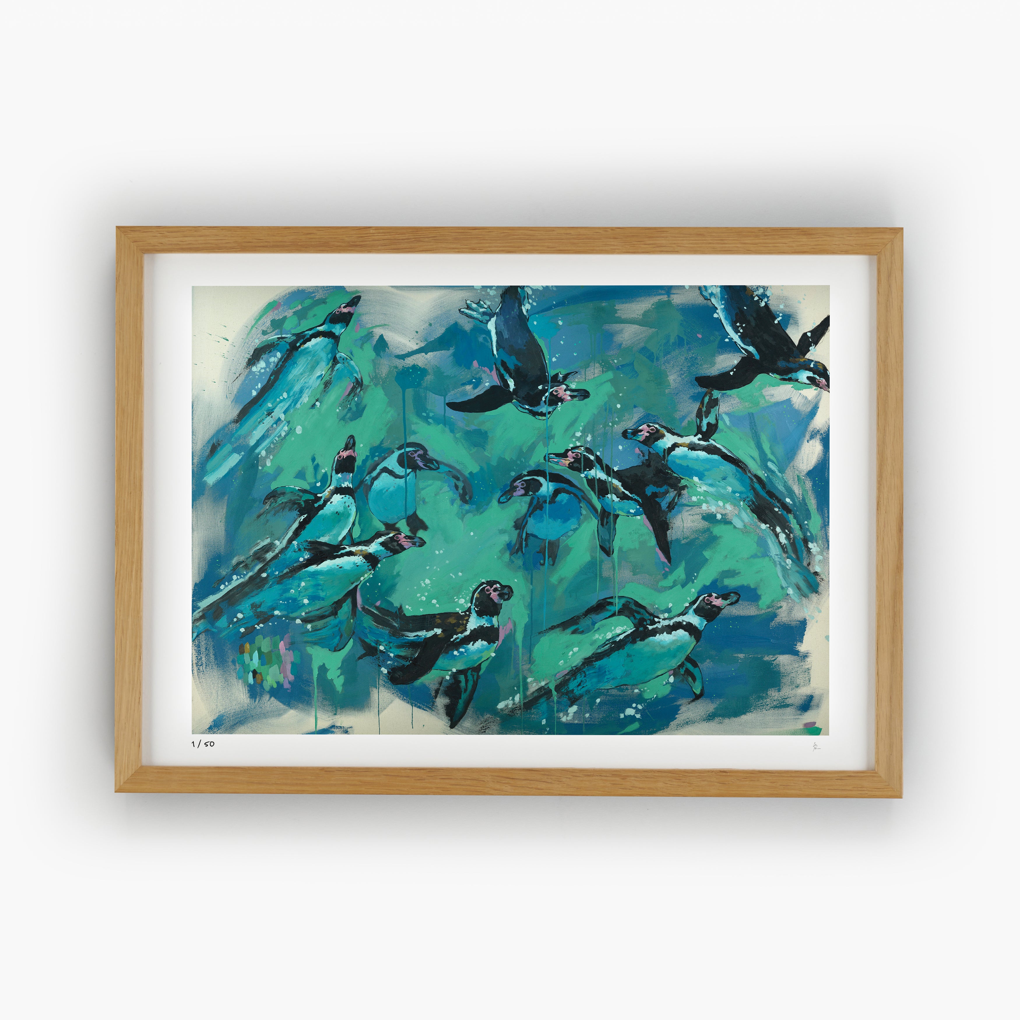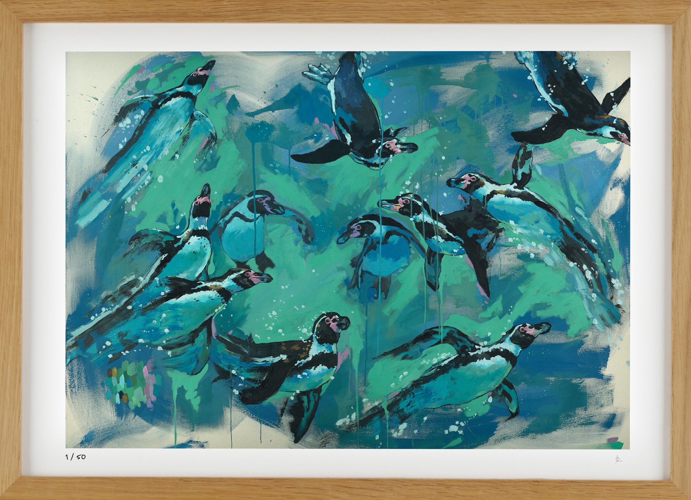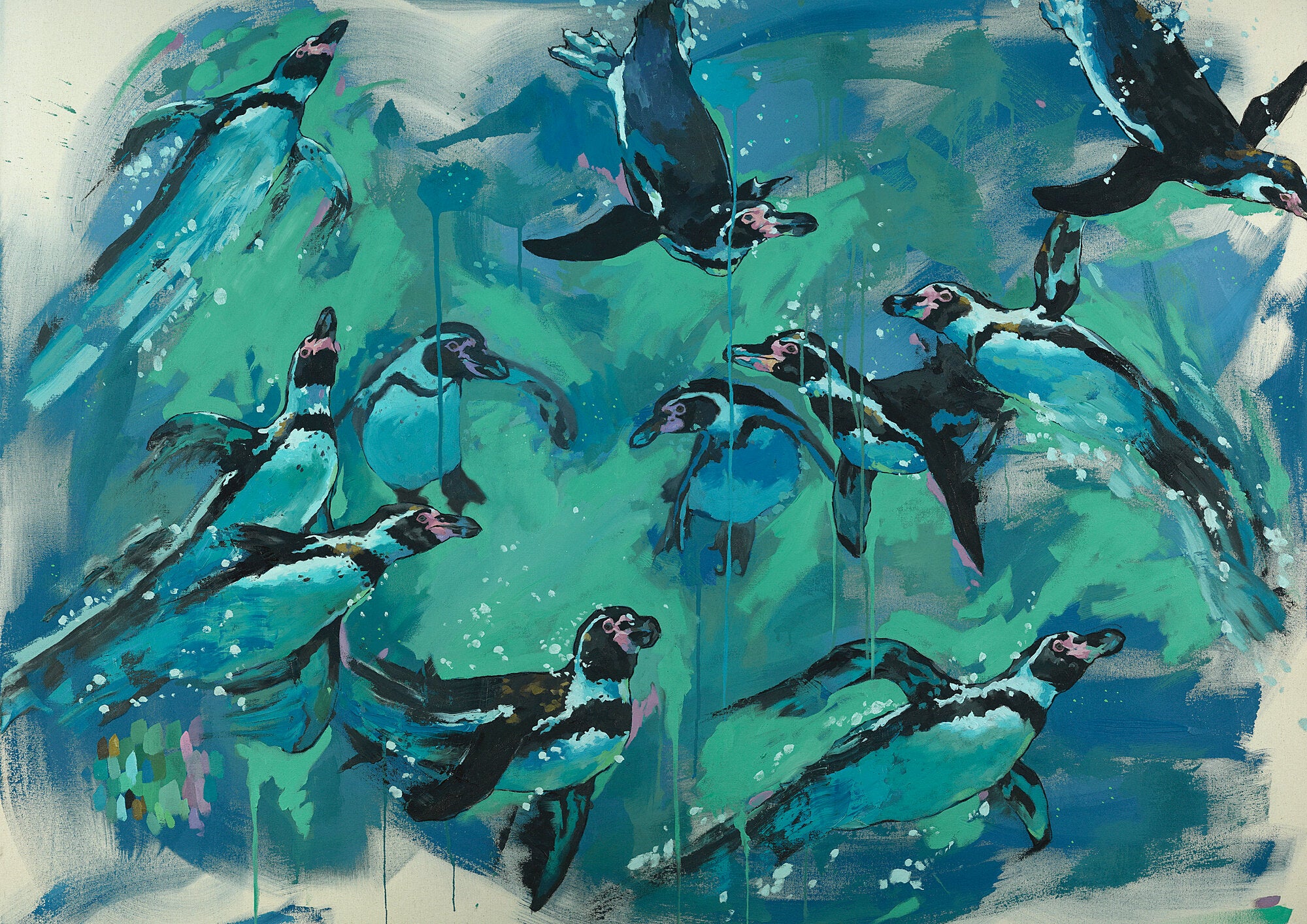 The artworks are displaying two species I studied during my time working with London Zoo. They are the Humbodlt penguin and the Partula snail. The works represent the story I have learned about both and their journeys around the world and the efforts made to support and rewild them by the staff working at ZSL. The works are titled "Enrichment" for the Humboldt penguins and "The big bad Wolf" for the Partula snails.